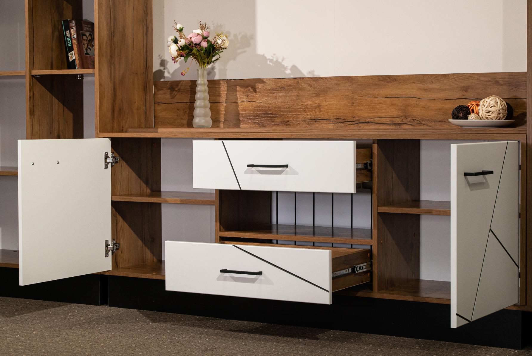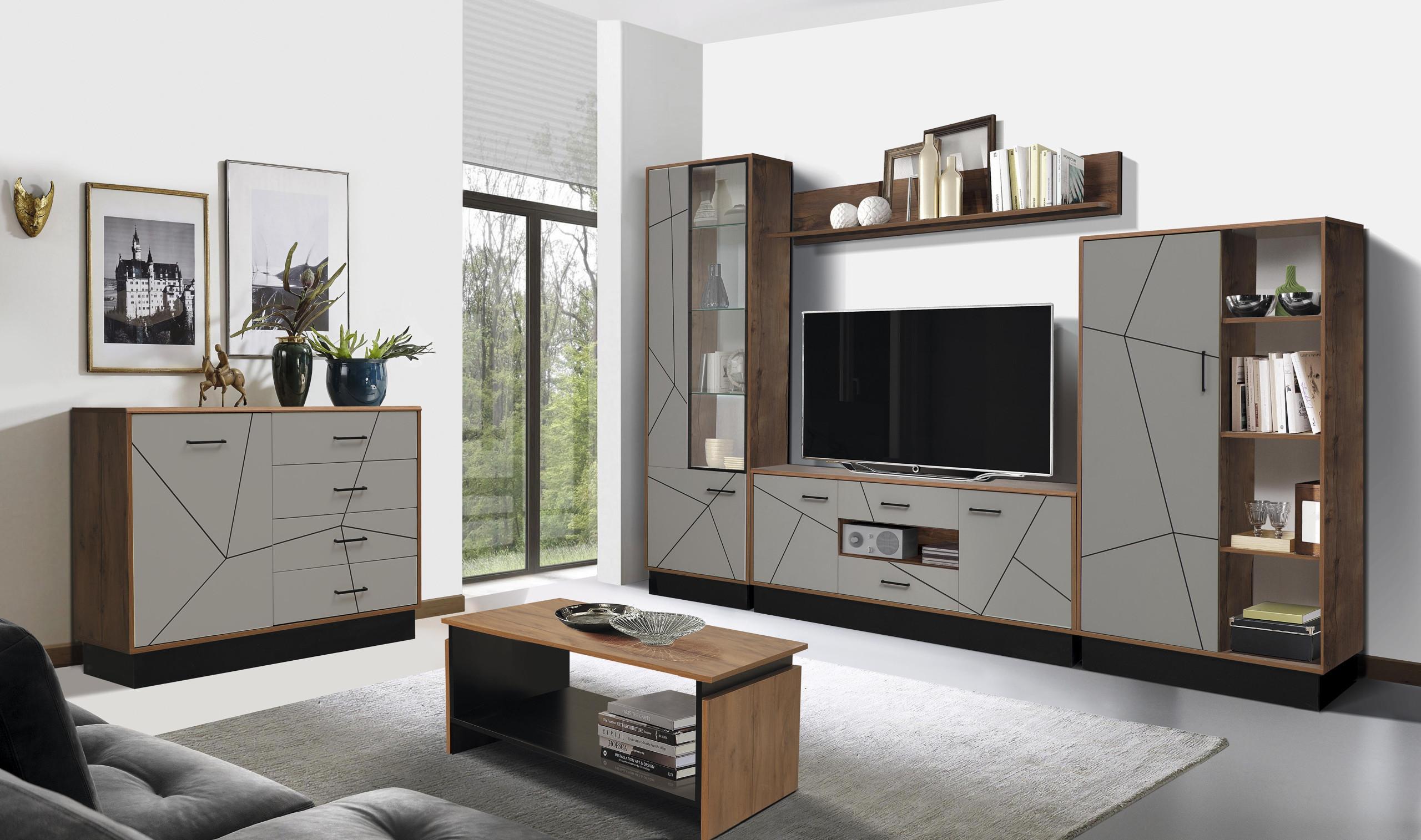 Модульная гостиная Гамма грей совмещает благородную привлекательную эстетику с практичностью и хорошим функционалом. Продуманный дизайн уместно дополнит созданный интерьер и органично впишется в любое помещение.