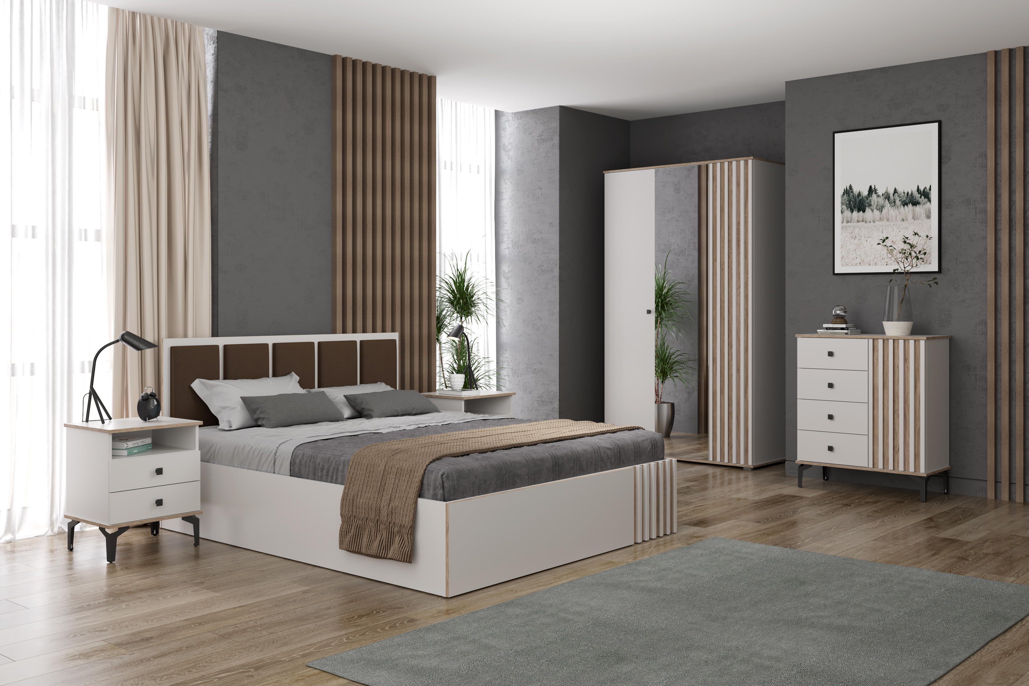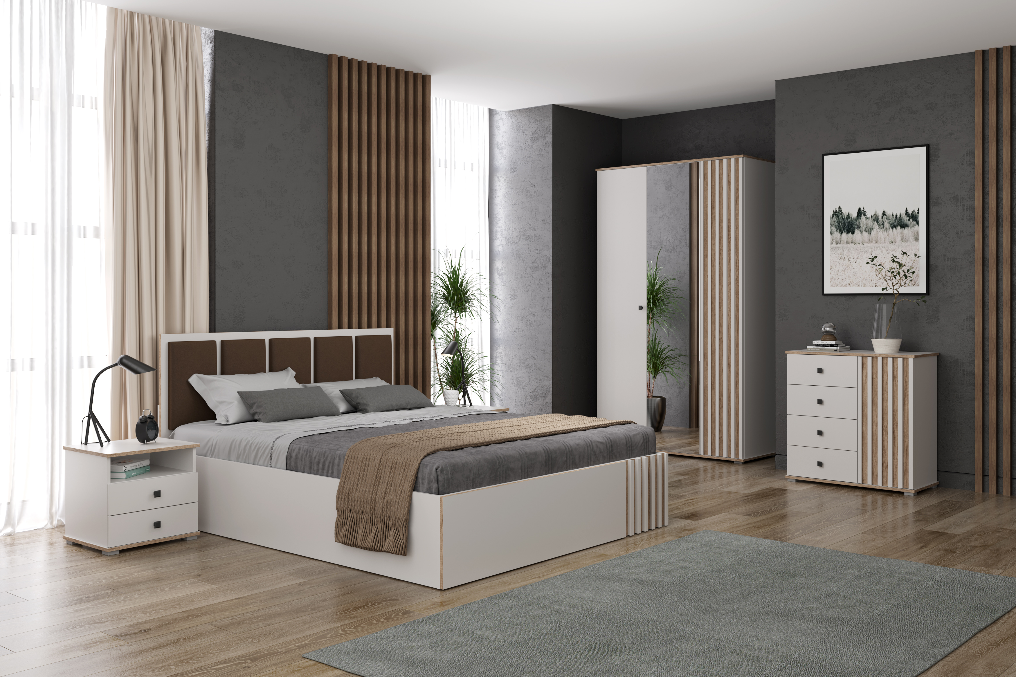 Спальный гарнитур Либерти белый дуб каньон совмещает благородную привлекательную эстетику с практичностью и хорошим функционалом. Продуманный дизайн уместно дополнит созданный интерьер и органично впишется в любое помещение.